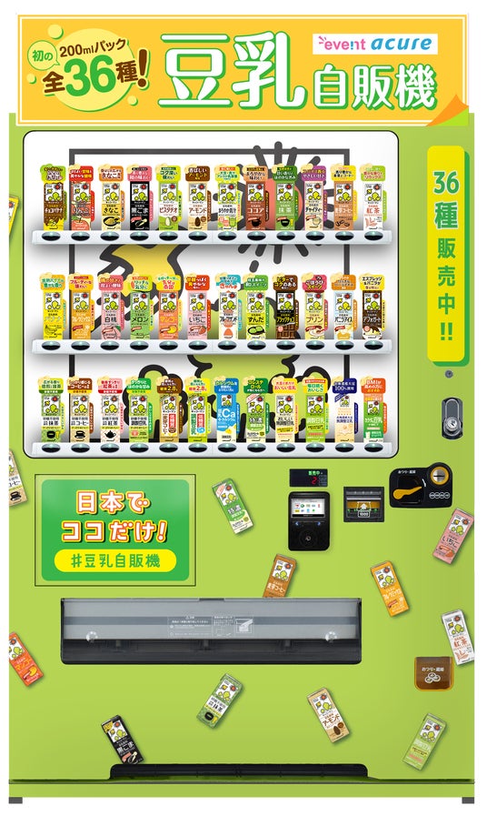 ● おいしい無調整豆乳や調製豆乳をはじめとした定番から、様々なフレーバー付きの豆乳まで、200mlパック36品が1台の自販機に並ぶ全国で初めての取り組みであり、この機会にぜひ足をお運びください。