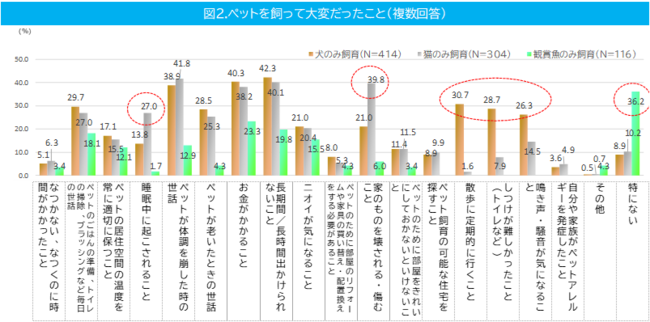 ペットごとに見ていくと、犬の飼育者では「散歩に定期的に行くこと(30.7%)」「しつけが難しかったこと(28.7%)」「鳴き声・騒音が気になること(26.3%)」、猫の飼育者では「家のものを壊される・傷むこと(39.8%)」「睡眠中に起こされること(27.0%)」がそれぞれの特徴として表れています。観賞魚の飼育者では「特にない」が36.2%と最も多くなっています。ペットごとに違いの見られる結果となりました。