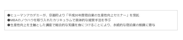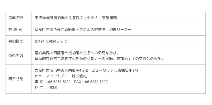 ヒューマンホールディングス株式会社の事業子会社で、教育事業を運営するヒューマンアカデミー株式会社(本社:東京都新宿区、代表取締役:新井 孝高、以下 ヒューマンアカデミー)は、京都府が実施する「平成30年度宿泊業の生産性向上セミナー実施業務」(以下、本事業)を受託しました。本事業は「お客様と従業員に選ばれ、最大生産性をあげる宿泊施設を創る」を全体テーマに、京都府内に所在する旅館・ホテルの経営者や現場リーダーに向け実施いたします。本事業を通じ、宿泊業界の有識者や成功者の知見や経営手法等の総合的知識を身につけることで、永続的な宿泊業の振興に寄与します。