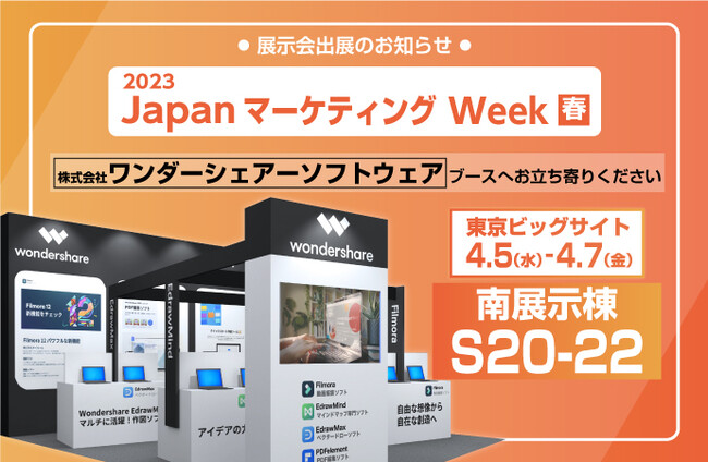 世界150か国以上で利用されるソフトウェアを手掛ける、株式会社ワンダーシェアーソフトウェア(東京都千代田区、代表:呉太兵)は、2023年4月5日 (水)~4月7日(金) まで、東京ビッグサイトで開催される「第6回 Japan マーケティング Week【春】」に出展いたします。近くにお立ち寄りの際はぜひブースまでお越しください。