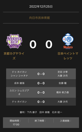 ノジマTリーグ 2022-2023シーズン 公式戦 12月25日開催 向日市民体育館(京都府) 京都カグヤライズ vs 日本ペイントマレッツ 対戦オーダーが発表されました。