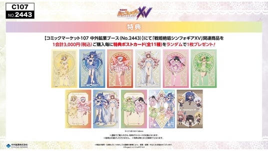 中外鉱業ブースにて『戦姫絶唱シンフォギアXV』C107関連商品を1会計3,000円(税込)ご購入毎に、特典ポストカード(全11種)をランダムで1枚プレゼントします。