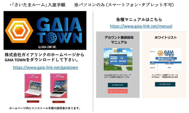 「さいたまルーム」にお越しいただくには、事前にご利用のPC(※)にてメタバースプラットフォーム「GAIA TOWN」のソフトをダウンロードおよびインストールが必要になります。詳細は、以下の手順をご確認ください。