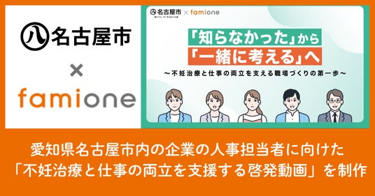 「子どもを願うすべての人によりそい 幸せな人生を歩める社会をつくる」をビジョンに掲げ、法人の従業員向け福利厚生や自治体の住民向け支援を行うヘルスケアサポートサービス「ファミワン」 https://famione.com/benefit/ などを展開する株式会社ファミワン(本社:東京都渋谷区、代表取締役:石川勇介)は、愛知県名古屋市から委託を受け、市内企業の人事担当者に向けた「不妊治療と仕事の両立」の啓発動画を作成し、公開開始(名古屋市公式YouTube 「まるはっちゅ~ぶ」 https://youtu.be/KIHw-H6Z944 )いたしました。