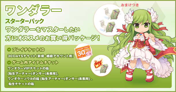 「ワンダラースターターパック」を発売いたします!本パッケージは30日分の利用権と、対応職業でステータスとスキルが30日間リセットし放題の「ワンダラーソウル」がセットになったパッケージです。また、本パッケージにはオマケとして、「3次職マスタープログラム」で対応職業にて追加サービスが受けられる「ワンダラーVIPチケット」と、キャラクターをいきなり転生させることができる「転生チケット」がついています。これからワンダラーでミッドガルド大陸にデビューする方にピッタリのパッケージとなっておりますので、ぜひご活用ください!