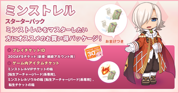 「ミンストレルスターターパック」を発売いたします!本パッケージは30日分の利用権と、対応職業でステータスとスキルが30日間リセットし放題の「ミンストレルソウル」がセットになったパッケージです。また、本パッケージにはオマケとして、「3次職マスタープログラム」で対応職業にて追加サービスが受けられる「ミンストレルVIPチケット」と、キャラクターをいきなり転生させることができる「転生チケット」がついています。これからミンストレルでミッドガルド大陸にデビューする方にピッタリのパッケージとなっておりますので、ぜひご活用ください!