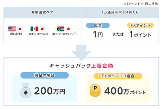 対象期間中にエントリーされ、かつ同期間中の『外貨ネクストネオ』における対象通貨ペアの新規注文の取引量に応じて、現金最大200万円をキャッシュバック!または最大400万円相当のFXポイントをプレゼントいたします。