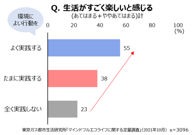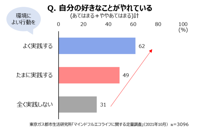 さらに、環境によい行動をたくさんとっている人ほど、「自分の好きなことがやれている」「生活がすごく楽しい」と感じていることがわかりました。