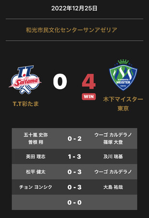 T.T彩たま と 木下マイスター東京の試合は0-4で木下マイスター東京が勝利しました。