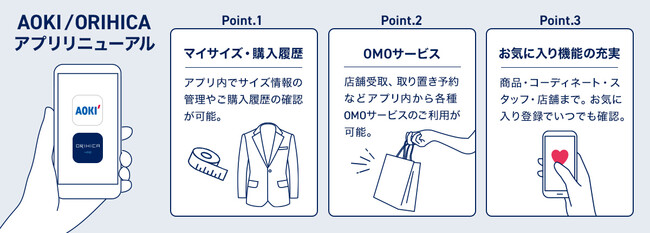 株式会社AOKI(代表取締役社長:森裕隆)は、さらなるOMO化の推進に向け、AOKI公式アプリ・ORIHICA公式アプリをリニューアルいたします。このリニューアルにより、各種WEBサービスをシームレスに提供するための基盤作りを行い、時代やお客様のご要望に合わせた快適な購買体験のご提供を目指します。