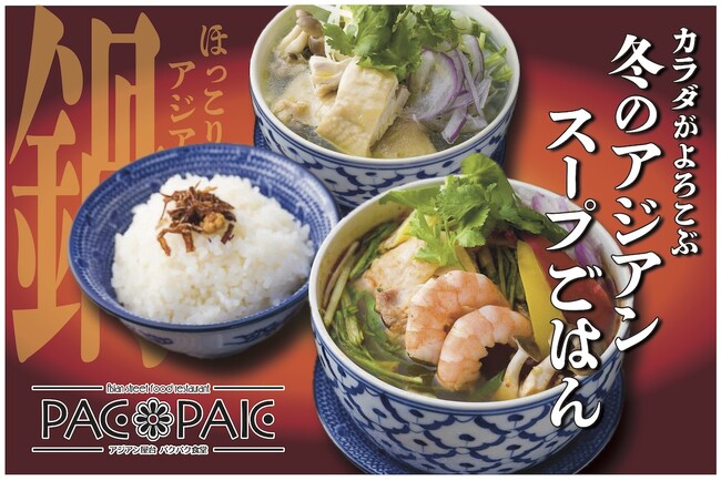 株式会社Globridge(グロブリッジ、本社:東京都港区赤坂、代表取締役:大塚 誠)の運営する 「アジアン屋台PACPAK食堂 イオンモール津田沼店」は、2023年12月19日(火)より、冬季限定で「アジアンスープごはん」シリーズの提供を開始しております。