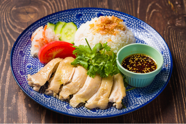 ・カオマンガイ 890円(税込)‥タイ料理を代表するチキンライス。チキンライスと言えどケチャップを使用した日本風のチキンライスとは異なり、ほろほろに柔らかくなった鶏肉をご飯の上に乗せた料理。米にはジャスミンライスを使用しており、一度食べればやみつきに。