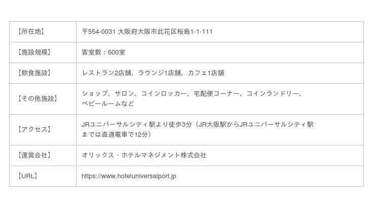 『ホテル ユニバーサル ポート』は、「とびっきりの笑顔に出会える!リゾート&エンターテイメントホテル」をテーマにした、ユニバーサル・スタジオ・ジャパンのオフィシャルホテルです。目の前にユニバーサルシティポートを臨み、パークまで歩いてすぐという素晴らしいロケーションです。当ホテルは、オリックス不動産株式会社の旅館・ホテル運営の事業ブランド「ORIX HOTELS & RESORTS」の「パークサイド」カテゴリーに属します。2020年7月15日に15周年を迎えました。
