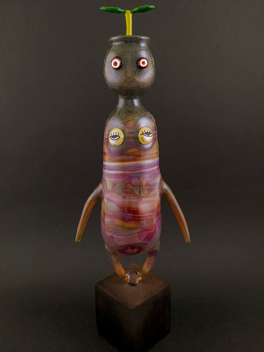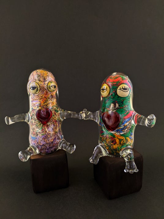 三平硝子の生み出すモンスターは、ガラスをバーナーの火の中に入れて、ガラスを溶かしながら制作する「バーナーワーク」と呼ばれる技術で作られます。三平自身に起きた出来事や世界的な出来事、自分のコンプレックスや、これまで出会った人から受ける「こんなこと起きるよね」「こんな人いるよね」といった、他者との共感を生むような感情に重きを置きながら、1つひとつにストーリーが存在するモンスターの姿を作り出しています。