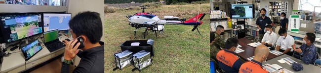 災害時・平時、および空撮・空輸の用途に応じ複数種のドローンを使用し、瀬戸内町古仁屋に設置したオペレーションセンターにて集中遠隔管理をしました。災害時はもとより平時運航においても、現地の運航環境状況、変化に即応できる運航管理体制を検証しました。