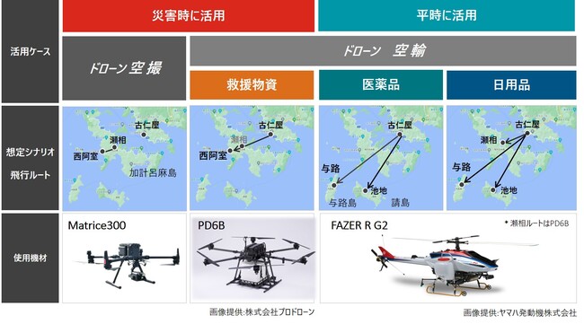 ドローンプロジェクトにおいては、これまで鹿児島県大島郡瀬戸内町とドローンを活用した地域課題解決を目指す連携協定(*2)を結び、「災害発生時の孤立集落への救援物資輸送」および「日用品や医療関係品の輸送サービス」について検証を進めてまいりました。