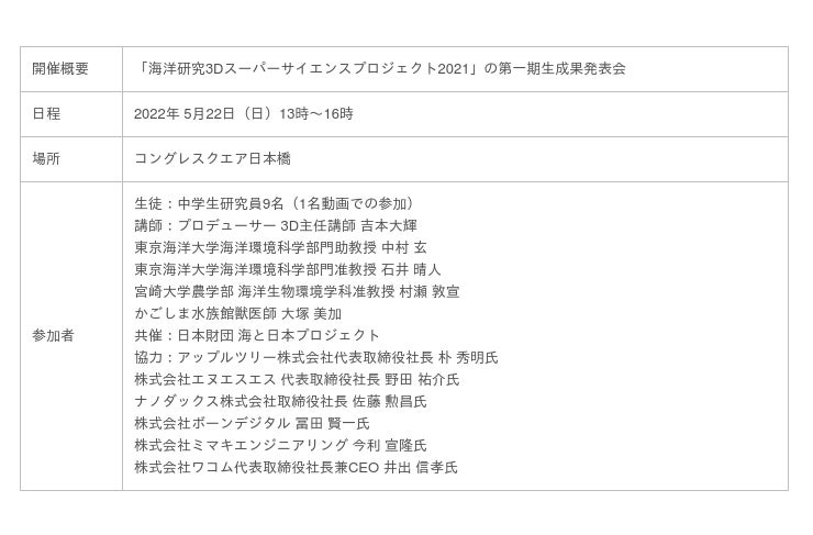 一般社団法人日本3D教育協会は、2022年5月22日、コングレスクエア日本橋にて、最新の3D技術を活用した海洋生物の研究を通じて、物事を深く追求できる人材を育成する「海洋研究3Dスーパーサイエンスプロジェクト2021」の第一期生成果発表会を実施しました。このイベントは、次世代へ海を引き継ぐために、海を介して人と人とがつながる“日本財団「海と日本プロジェクト」”の一環です。