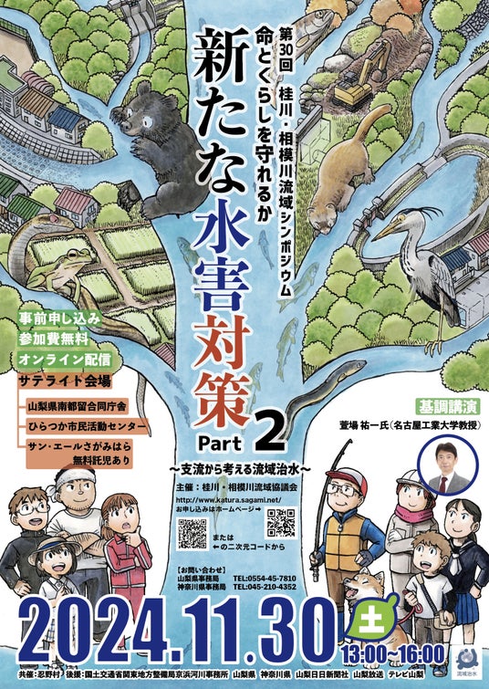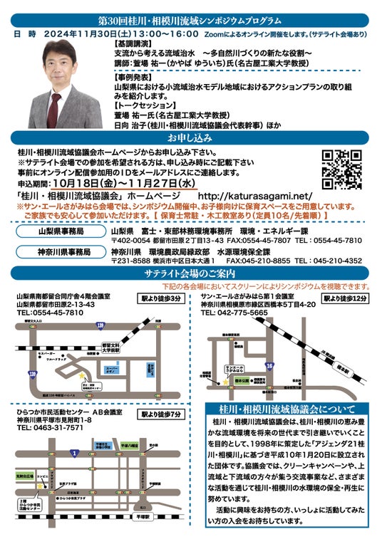 「桂川・相模川流域協議会」は、桂川・相模川の恵み豊かな流域環境を将来の世代まで引き継いでいくため、市民・事業者・行政が連携した様々な活動に取り組んでいます。このたび、今般の頻発化・激甚化する自然災害に着目し、「支流から考える流域治水」についての基調講演や、事例発表などを通じて、流域の環境保全に向けた意識の醸成を図るため、「第30回 桂川・相模川流域シンポジウム」を開催します。