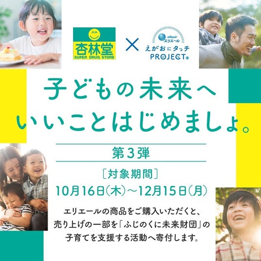 衛生用紙製品 No.1ブランド※1の「エリエール」を展開する大王製紙株式会社(本社:東京都千代田区、代表取締役 社長執行役員:若林 賴房)は、からだとこころの触れ合いによって幸せと笑顔を増やす「エリエール えがおにタッチPROJECT」の一環として、本プロジェクトに賛同いただいた株式会社杏林堂薬局(本社:静岡県浜松市、代表取締役 社長:小河路 直孝)と共同で、「子どもの未来へ いいことはじめましょ。」キャンペーン第三弾を2025年10月16日(木)~12月15日(月)に実施しました。キャンペーン期間中の売り上げの一部は、引き続き静岡県内のさまざまな社会課題解決のために活躍されているNPOや各種団体と個人・企業の想いをつなぐ公益財団法人「ふじのくに未来財団」に寄付します。