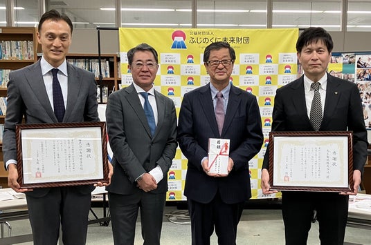 大王製紙と杏林堂薬局から寄付金の目録を贈呈。ふじのくに未来財団からは感謝状が贈呈されました。