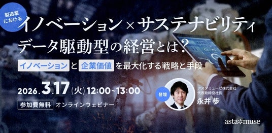 アスタミューゼ株式会社(本社:東京都千代田区、代表取締役社長 永井歩)は、2026年3月17日(火)12:00-13:00に、無料ウェビナー「製造業における「イノベーションxサステナビリティ」データ駆動型の経営とは? ~イノベーションと企業価値を最大化する戦略と手段~」を再開催いたします。