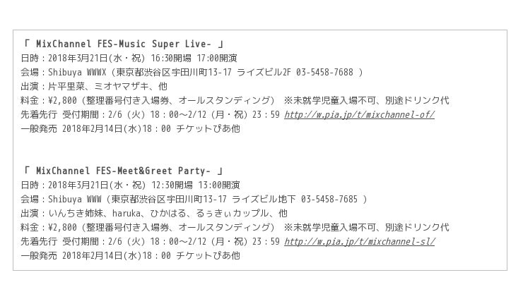 3月21日(水・祝)、 東京・Shibuya WWWにて「MixChannel FES-Meet&Greet Party- 」 & 東京・Shibuya WWWXにて「 MixChannel FES-Music Super Live- 」の同日2公演!