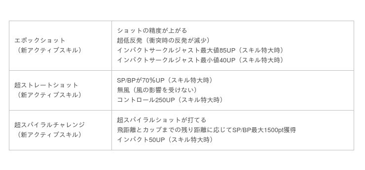 スパイラルショット:スキルが備わったギアを装備し、スーパーサイドスピンをかけて打ったボールがピンに直接当たった際に、ボールがピンに巻き付くようにカップインする。成功するとSP/BPを獲得できる。