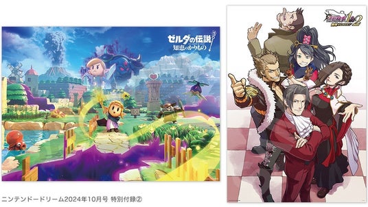 片面は『ゼルダの伝説 知恵のかりもの』のメインビジュアル。もう片面は本誌連載でおなじみ、岩元辰郎さんによる『逆転検事1&2 御剣セレクション』描き下ろしビジュアルです。大きなB2サイズなので、どちらの面も美麗なアートをすみずみまで堪能できます。