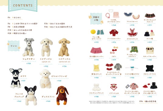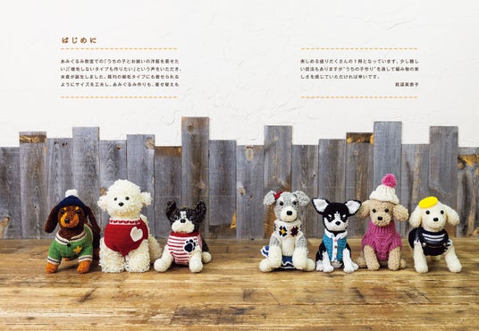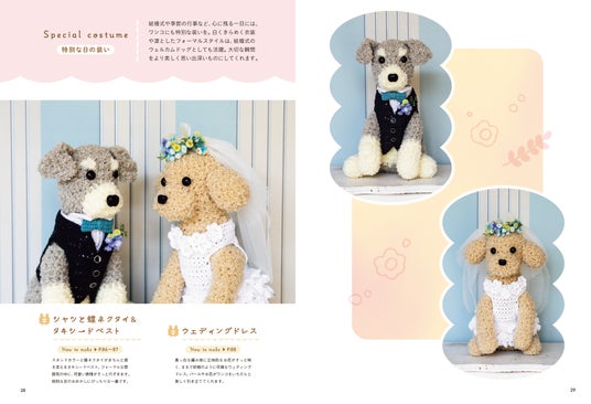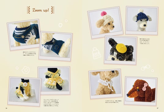 また、本書の著者・眞道美恵子さんの既刊『抱っこしたくなるあみぐるみワンコ』の作品にも着せ替えできるよう、サイズを調整しています。植毛タイプのワンコたちにも着回しができます。