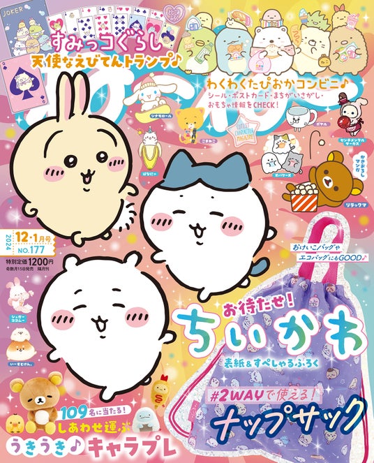 今号の『ねーねー』の表紙は、「ちいかわ」が目印です♪ ちいかわ、ハチワレ、うさぎの楽しそうな姿が超可愛い(ハート) 他にも「すみっコぐらし」の「わくわくたぴおかコンビニ」テーマや、人気キャラたちが集合しているよ♪
