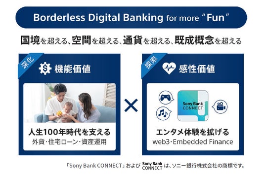 ソニー銀行は「Borderless Digital Banking for more “Fun”」をコンセプトに、国境・通貨・空間の垣根を超えて、人生100年時代における個人と家族の安心を支える機能価値と、エンタテインメントとの連携を通じた体験の場の拡張や不の解消による感性価値を創出し、お客さまにあらたな感動体験・価値提供を目指して挑戦を続けていきます。