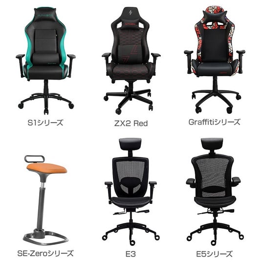 ゲーミングチェアは、3色のカラーバリエーションから選択可能な「S1」シリーズと、高品質な縫製を施した「ZX2 Red」、カラフルなデザインの「Graffiti」シリーズをラインナップ。長時間のゲームプレイにおいて快適な座り心地を実現します。