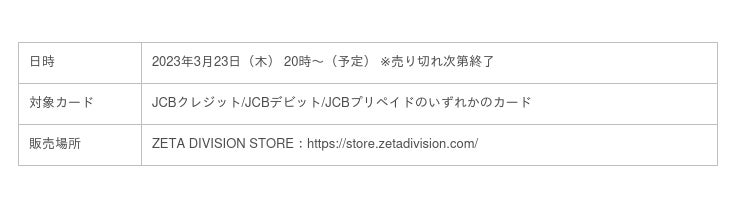 3月24日(金)の一般販売に先駆けて、3月23日(木)に、「ZETA DIVISION」の公式グッズ販売ページにて、JCBブランド会員様限定でオリジナルグッズを先行販売いたします。