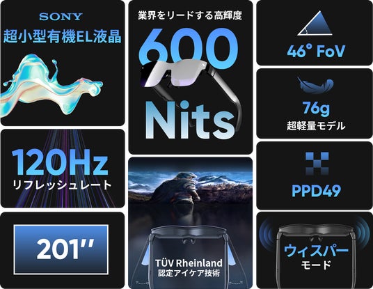 ディスプレイにはSONY製省電力マイクロOLED(有機EL)を搭載し、驚異の120MHzのリフレッシュレートで、発色豊かな滑らかで美しい映像・ゲーム体験をお楽しみいただけます。