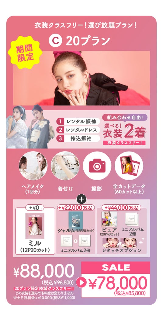 コミコミ20プランは成人式振袖レンタル+撮影のセットプランで、衣装が追加料金なしのクラスフリー。3万円以上が割引になっています。
