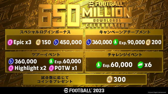 さらに、6億5000万ダウンロード突破を記念したキャンペーンでは、強力な選手が当たる抽選契約権や選手獲得に必要なeFootball(TM)コインをプレゼントするほか、育成に必要な「スキルトレーニングプログラム」などもイベント報酬として配布します。