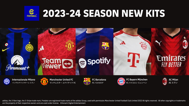 「eFootball(TM)」のオフィシャルパートナークラブである「FCバルセロナ」「FCバイエルン ミュンヘン」「マンチェスター ユナイテッドFC」「ACミラン」「インテルナツィオーレ ミラノ」など計9クラブにおいては、2023 -24 シーズンで着用する新ユニフォームでお楽しみいただけます。