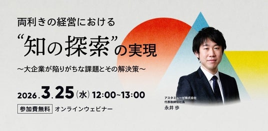 アスタミューゼ株式会社(本社:東京都千代田区、代表取締役社長 永井歩)は、2026年3月25日(水)12:00-13:00に、無料ウェビナー「両利きの経営における「知の探索」の実現 ~大企業が陥りがちな課題とその解決策~」を開催いたします。失敗・課題を解決する方法や取り組み事例について具体的にご紹介致します。