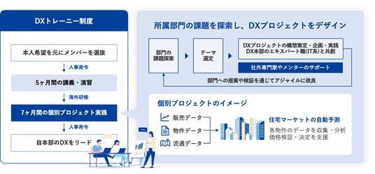 DXトレーニー制度では、事業部門・グループ会社の総合職がDX本部へ1年間異動し、デジタルに関する5か月間の講義・演習と、所属部門の事業課題を起点とした7か月間のDXプロジェクト※3実践に取り組みます。初年度は三井不動産、三井不動産レジデンシャルから5名が選出されました。次年度以降は部門・人数を拡大して展開していく予定です。