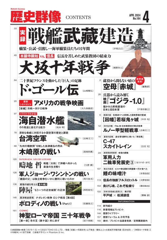 また劇中のカット多数を掲載した「兵器から読み解く映画『ゴジラ-1.0』」と「新写真発見!就役から間もない頃の空母『赤城』」の2本の特別企画も掲載。