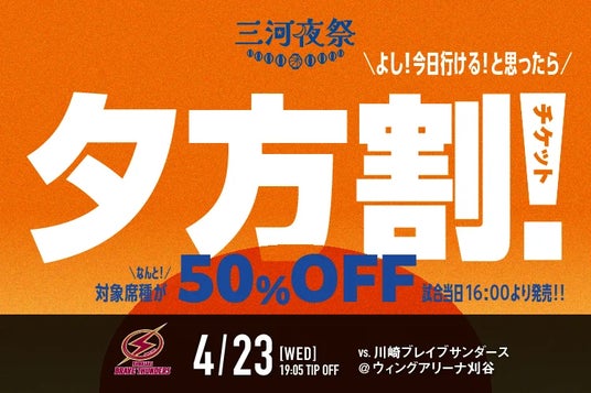 この度、3月19日(水)秋田ノーザンハピネッツ戦でご好評いただきました「夕方割!チケット」を4月23日(水)川崎ブレイブサンダース戦でも発売いたします!