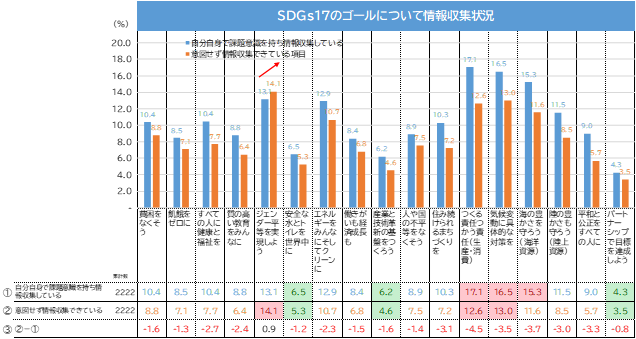 「ジェンダー平等を実現しよう」は、意図せず情報収集できており、自身の情報収集の割合を上回る唯一の項目です。自治体や社会などでの制度改定に加え、学校教育や社会教育、メディア等での情報発信も個々人に届いて認識されているようです。