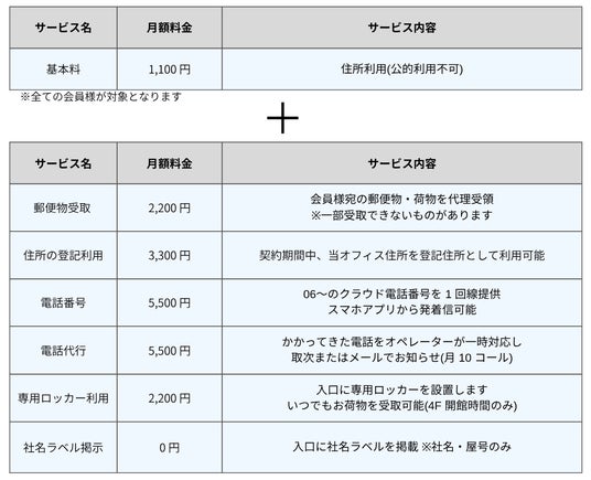 たとえば、ホームページや名刺等の印刷物に掲載する住所を使いたい場合は、「基本料」のみでご利用でき、「登記利用」は必要ないが「電話番号」や「電話代行」を使いたい等のご利用も可能です。