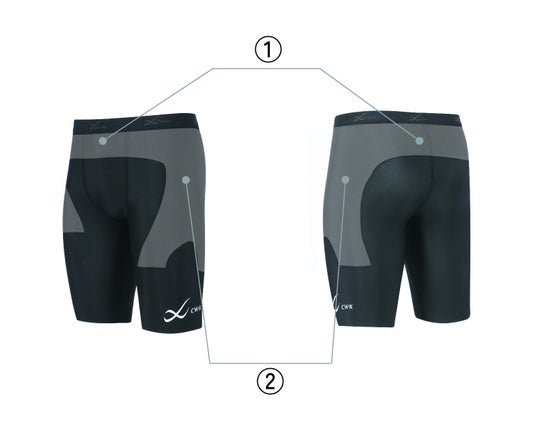 「CW-X」独自のテーピング原理を活用し、両脇から股関節を、前後から骨盤をサポート。股関節の安定性を向上させ、下半身の軸がブレにくい構造です。