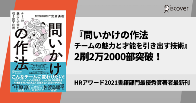 株式会社ディスカヴァー・トゥエンティワン(本社:東京都千代田区、取締役社長:谷口奈緒美)は2021年12月23日発売の『問いかけの作法:チームの魅力と才能を引き出す技術』を8000部増刷し、2万2000部を突破しました。著者はHRアワード2021書籍部門最優秀賞受賞作品である『問いのデザイン:創造的対話のファシリテーション』(学芸出版社)著者の安斎勇樹氏です。