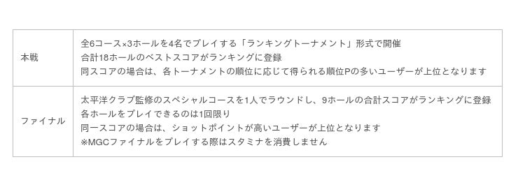 MGCは、『みんゴル』上の「みんゴルファー(=プレイヤー)」No.1の座を競う大会で、「MGC本戦」と「MGCファイナル」で構成されます。