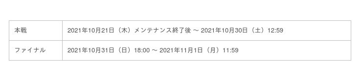 開催期間:2021年10月21日(木)メンテナンス終了後 ~ 2021年11月1日(月) 11:59