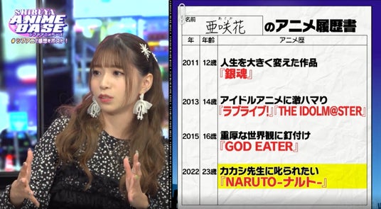 亜咲花さんは、人生を変えたアニメに12歳で出会ったという『銀魂』を挙げ、アメリカに住んでいたころは「専属で声優がついているアニメは海外にはあまりなかったそう」で、その面白さに感激。「笑いと涙のバランスや音楽がめちゃくちゃいいんですよ」と語ります。2年後、『ラブライブ!』や『THE IDOLM@STER』にハマったそうで、なんと『THE IDOLM@STER』は和太鼓リズムゲーム『太鼓の達人』で出会い、「いい楽曲だなって思って」と独特な出会いだったことを明かします。その後、16歳のときには『GOD EATER』にどハマり。「殺伐とした世界観や雨宮リンドウがかっこいいんですよ、上司に欲しいなと思って」と口にします。2022年には、なんと『NARUTO-ナルト-』にハマったそうで、「ずっと応援している方に申し訳ないなとなかなか足を踏み入れられなかったものの、大人になって見たらサスケの見た目が可愛いなって思っちゃって…」とまたも独特すぎるエピソードを披露しました。