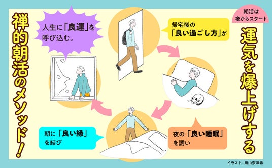 禅では充実した朝を過ごすことを「朝によい縁を結ぶ」といいます。「善因善果」というように、よい縁(善因)を結ぶことは、よい結果(善果)をもたらす、すなわちいい朝を迎えることで、その日の仕事もプライベートも、よい方向に動いていくという考え方です。