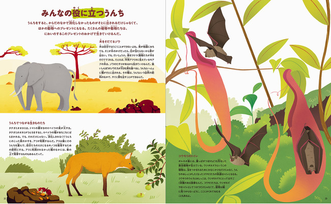 うんちの驚くべき役割や動物の生態についても楽しく学べる絵本。